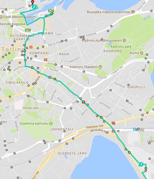 Автобус № 2 курсирует между Таллиннским аэропортом и Таллиннским портом. В аэропорту автобус № 2 отправляется с автобусной остановки Lennujaam, рядом с остановкой общественного транспорта. Отсюда автобус едет в направлении «Рейсисадам». Если вы хотите поехать в центр города, вы можете выйти на автобусной остановке ‘A. Лайкмаа, отсюда несколько минут ходьбы до центра Таллинна.