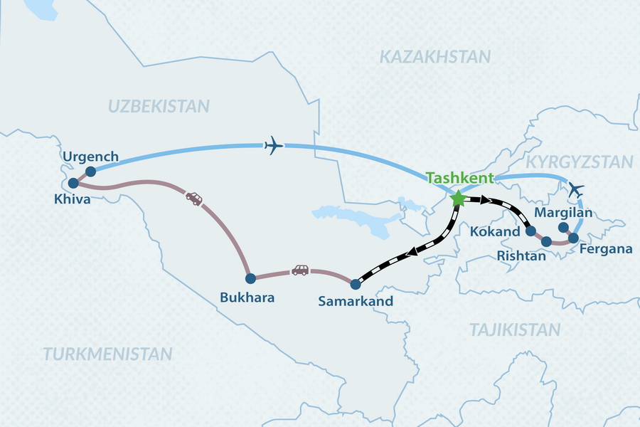 Впервые приехавший в Ташкент, Самарканд, Бухару и Хиву обязательно должен посетить города. Ташкент и Самарканд — достаточно обширные и относительно современные города. Бухара – это место, в котором вам захочется провести больше всего времени, очаровательное и компактное.