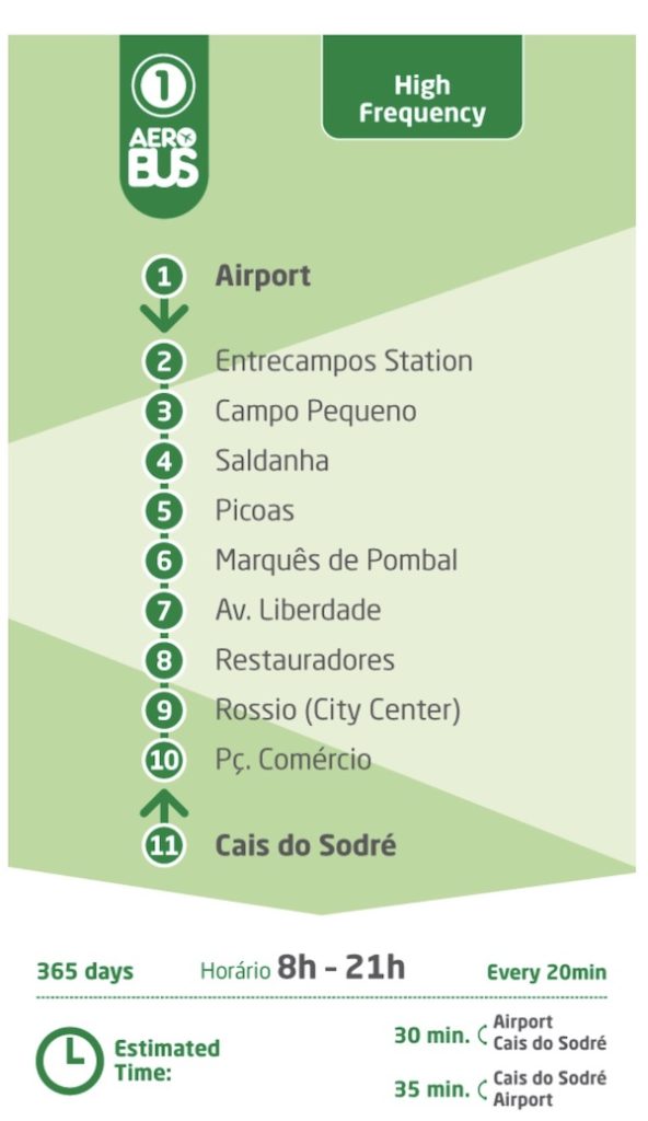 Остановки в аэропорту Лиссабона находится напротив терминала прибытия. Автобусы курсируют с 06:55 до 22:55 с интервалом 10-18 минут; ночью они не ходят.