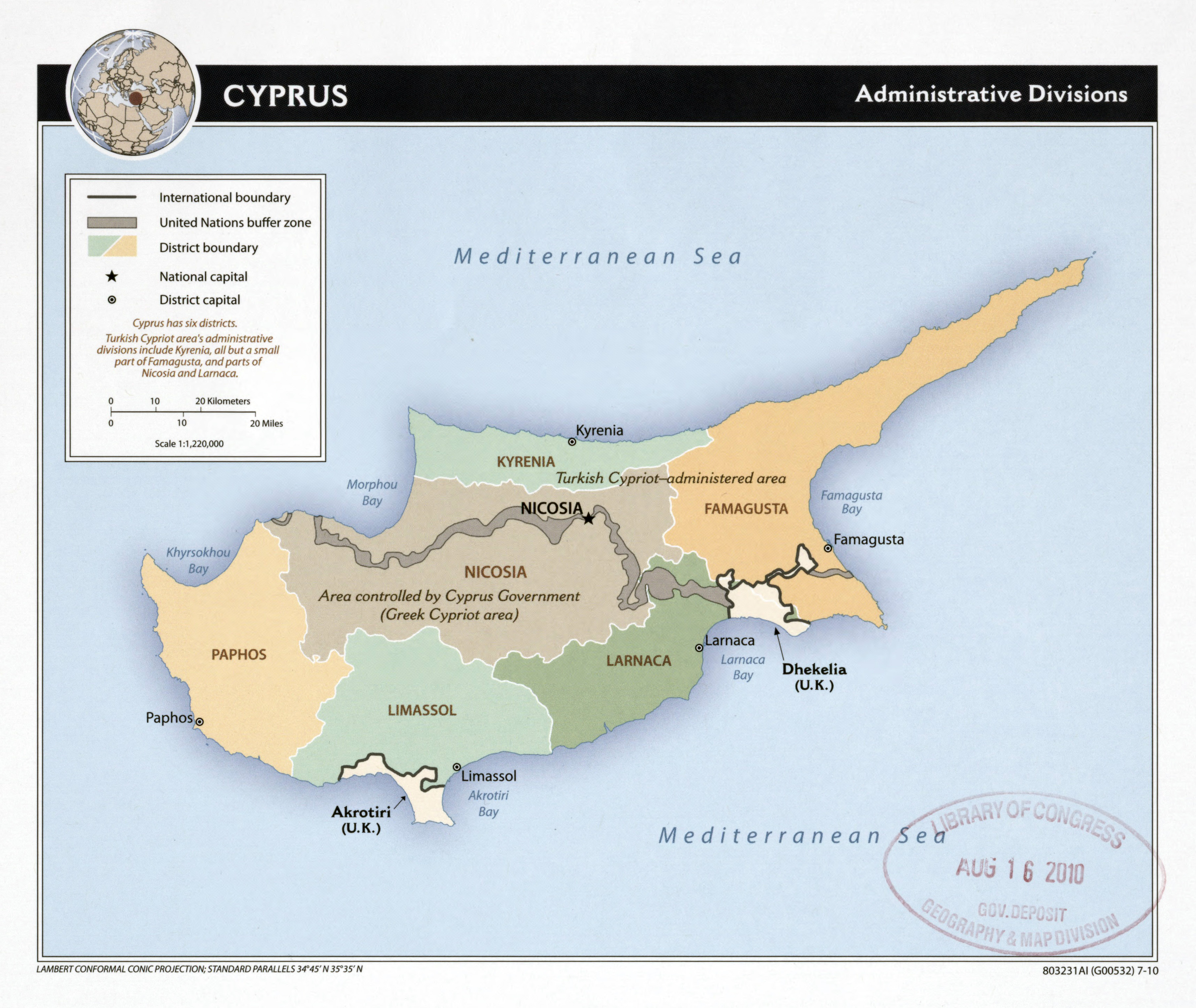Сегодня Кипр разделен на три части: в южной части острова находится Республика Кипр, занимающая примерно 60 процентов территории острова. Северная часть, оккупированная Турцией, составляет остальные 40 процентов или около того. Между ними находится буферная зона, поддерживаемая ООН, которая обеспечивает прекращение огня между двумя воюющими сторонами.