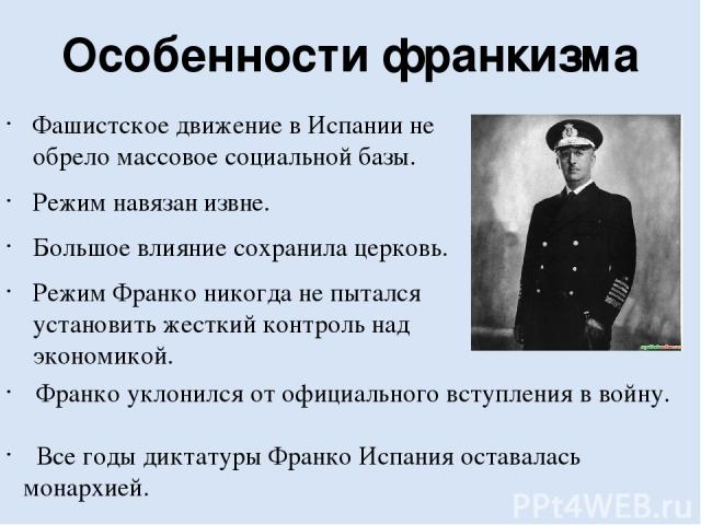 Идеология Франко (насколько она у него была) отличалась от идеологии Муссолини и Гитлера.