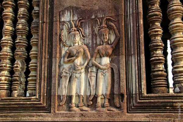 А на этой стене изображены апсары – мифические небесные танцовщицы. Кстати, в храме Ангкор-Ват были и настоящие танцовщицы, изображающие апсар, которые развлекали короля. А слева мы видим окна – стекла тогда не было, поэтому окна были каменные – такие вырезанные мини-колонны, через вырезы проходил солнечный свет.