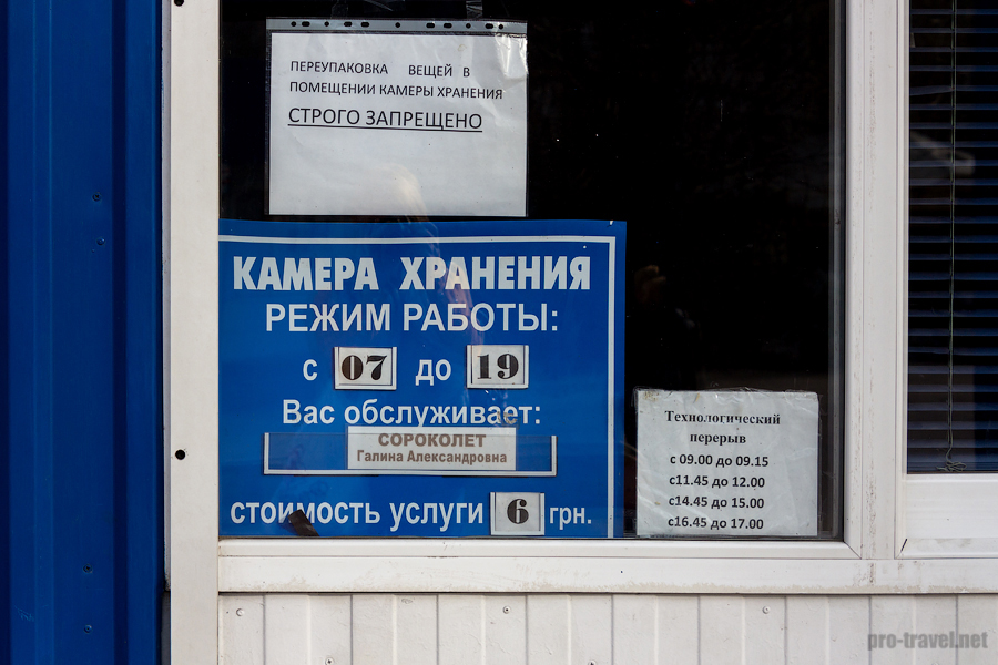 Камера хранения работает круглосуточно (2 стационарных и 2 автоматическая), стоимость от 20 UAH/сутки (в зависимости от размера багажа).