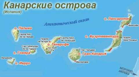 Канарские острова расположены в Атлантическом океане, у северо–западного побережья Африки. В архипелаг входят семь крупных и много мелких островов. Общая их площадь — 7,3 тысяч кв.км, население — около 1,5 млн. человек. Основные острова — Гран-Канария, Тенерифе, Фуэртевентура, Лансароте.