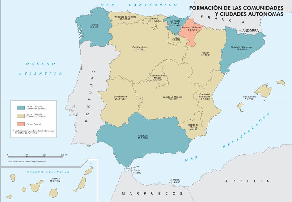 Существующее здесь Государство автономий (оно включает 17 автономных сообществ и два автономных города Сеута и Мелилья на побережье Северной Африки) за годы демократического развития доказало свою жизнеспособность. Вместе с тем эта модель государственно-территориальной организации постоянно оставалась объектом политической борьбы, заметно обострившейся в последние годы. Одни политические силы настаивают на сохранении Государства автономий при возможном внесении некоторых корректив, другие требуют его превращения в федерацию, третьи – в конфедерацию, четвертые борются за полную независимость своих территорий.