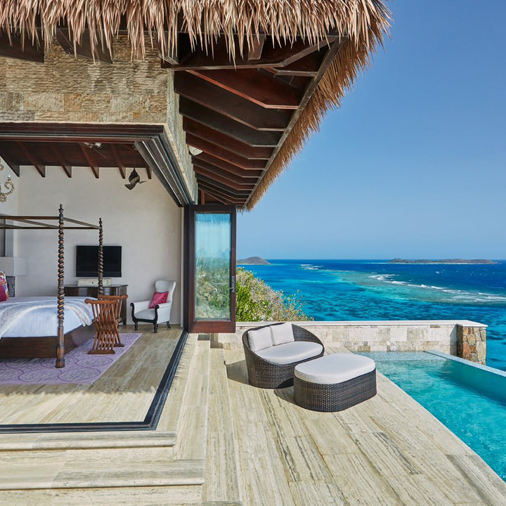 Красивый пляжный коттедж в стиле коттеджа с видом на океан и прямым выходом на частный пляж отеля с бесплатными шезлонгами и зонтиками.