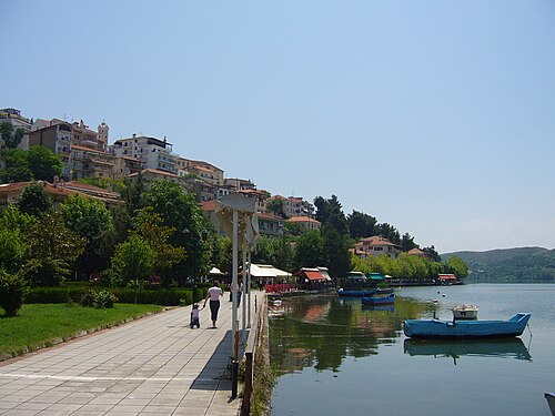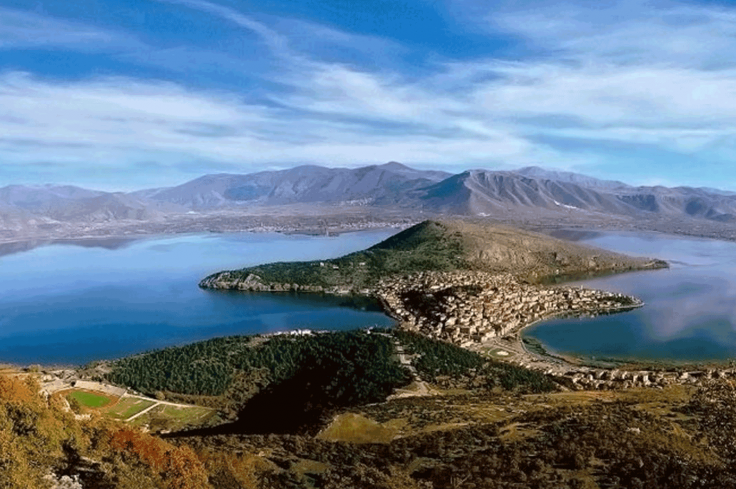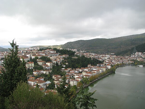 Город находится на высоте 630 метров над уровнем моря, между горами Вици и Граммос, и окружен озером, соединяясь с сушей полосой земли, образовавшейся в процессе насыпных работ.