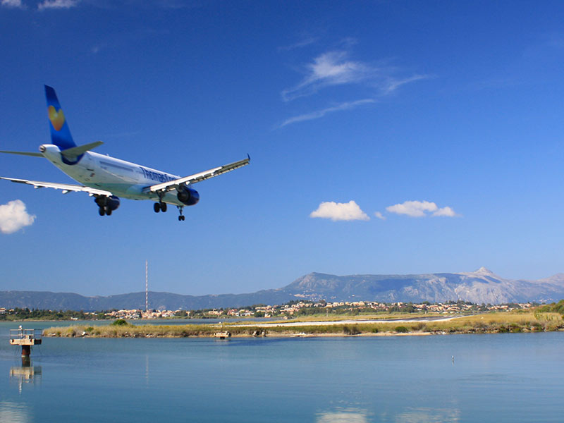 При приземлении с юга, что обычно и происходит, пассажиры имеют возможность полюбоваться великолепным панорамным видом на Понтикониси и монастырь Влахрена, а также на холмы Нормана, так как посадочный коридор находится всего в нескольких сотнях метров от этих потрясающих достопримечательностей.