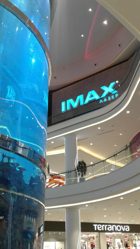 Его ширина составляет 28 050 мм, высота — 15 670 мм. Зал IMAX Laser оснащен передовой проекционно-акустической системой. Ее основная особенность — лазерные проекторы Dual-4K, разработанные специально для самых больших экранов IMAX. IMAX считают лучшим форматом кинопоказа на сегодняшний день: система создает очень правдоподобный эффект присутствия. Премьерный зал IMAX на 578 мест