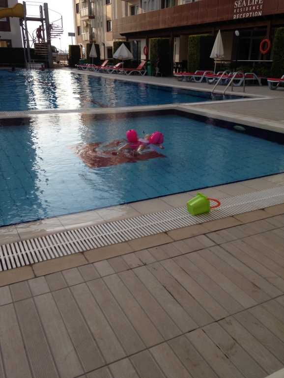 По дороге к морю расположены ипподром и еще 2 комплекса: Sea life и Mediterranean. От них до моря 3 минуты, буквально перейти через дорогу и подземный переход. Sea life -это 3 разновысотных дома (5-9 этажей), с собственным взрослым бассейном с горкой и детским. На первом этаже рецепция, аренда машин, салон красоты и кафе, которое почему-то открылось только в начале октября)