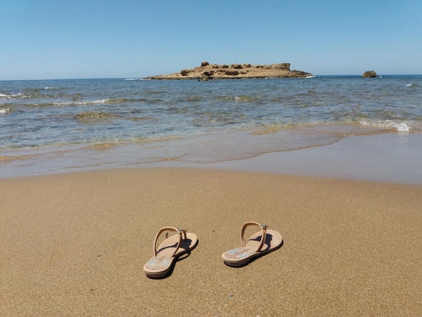 На горизонте синеет море. В 20-30 метрах от берега мы видим небольшую скалу, выступающую из моря — она слишком мала для того, чтобы быть островом, но все равно интересно.