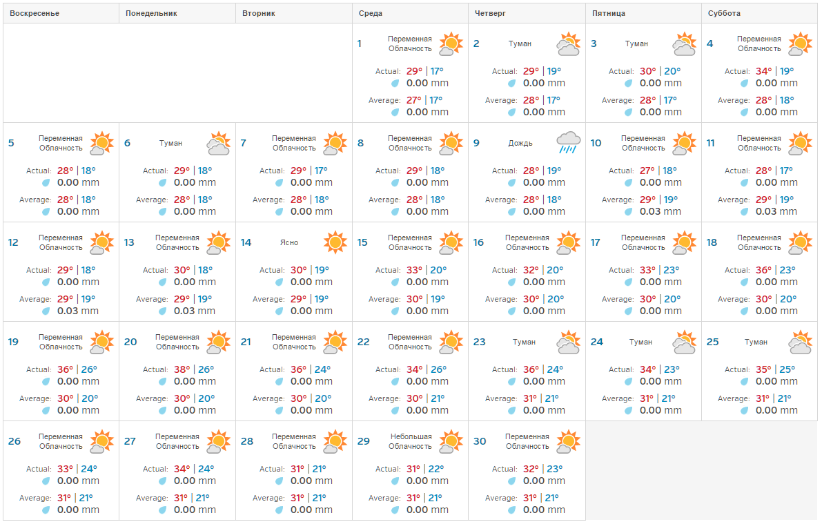 | Температура Ноябрь | 18.4°C | Осадки Ноябрь | 43mm | ||