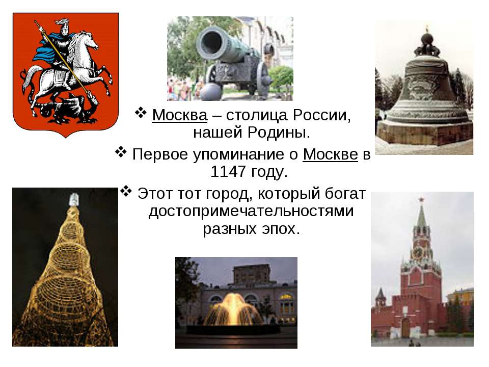Столица появилась на стыке Москвы-реки с рекой Негилиннай. По словам археологов, поселения на территории Москвы появились тысячи лет назад.Согласно легендам, великий князь Юрий Владимирович Долгорукий пригласил князя Святослава Игоревича (из «Слово о полку Игорево») на место нынешней Москвы и устроили пир, после которого был основан город.