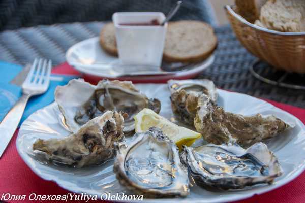 Еще одной гастрономической особенностью Коллиура являются устричные фермы. Их расположено множество вдоль набережной. Я читала, что их предлагают в разных вариантах блюд, но мы изучив меню многих ресторанов, встретили только один вариант подачи — традиционный — сырые устрицы с соусом, лимоном и гренками с маслом.