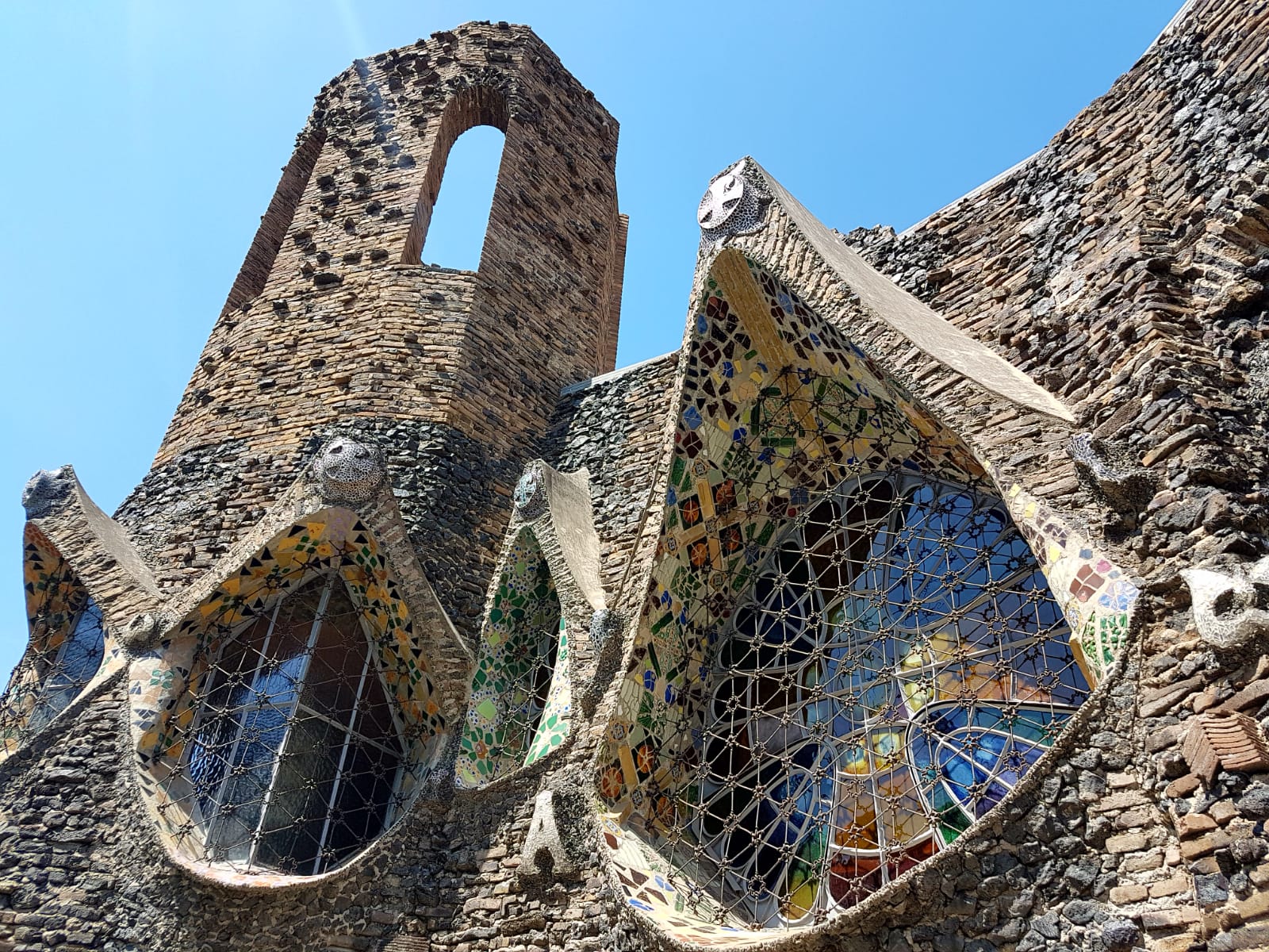 Проходя под портиком, вы видите, как Гауди решил выделить эти параболические формы с помощью треугольных цветных плиток. Огромная мозаика над дверью церкви полна христианской символики, связанной с Девой Марией и христианскими добродетелями. Колонны и внешняя часть склепа сделаны из известняка из карьеров, принадлежащих Гуэлю, и металлолома с близлежащих заводов. Оконные решетки сделаны из сломанных ткацких станков с фабрики Гуэля — Гауди любил перерабатывать материалы и использовать их неожиданным образом!