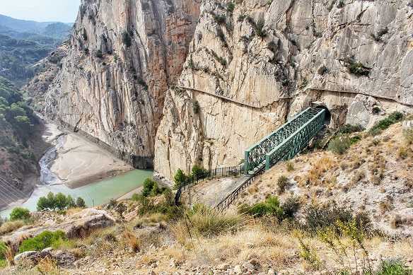 - Третья часть маршрута начинается из долины и ведет путников в другое ущелье Desfiladero de los Gaitanes. Так как на всем протяжении Caminito del Rey параллельно маршруту проходит железная дорога виды на мосты между ее тоннелями в этом ущелье невероятно красивые! В конце ущелья вы пересечете подвесной мост Puente Colgante и выйдете на южную сторону маршрута к водохранилищу Embalse de Tajo de la Encantada. Здесь вас поразит контраст рельефа скалистых гор ущелья с остальными. Далее вы постепенно спуститесь вниз к широкой тропе вдоль водохранилища, вдоль которой стоят величавые многовековые эвкалипты и , продолжая свой путь мимо железнодорожного арочного моста , вы выйдете к южным воротам маршрута.