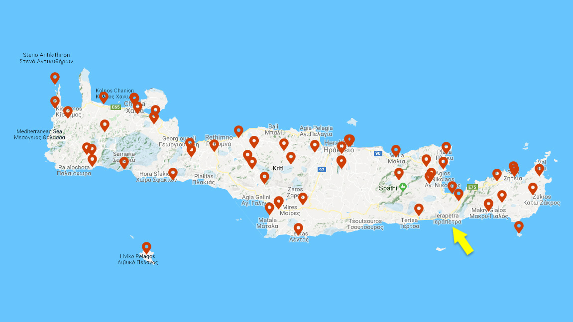 Карта Крита демонстрирует уникальное положение острова — находится между тремя частями света — Европой (в 110 километрах), Азией (в 175 километрах) и Африкой (в 300 километрах). Южная береговая линия Крита является самой южной частью Европы. Греческий остров омывается водами двух морей: Эгейского — на севере и Средиземного — на трех остальных побережьях. Береговая линия вытянулась на 1046 километров.