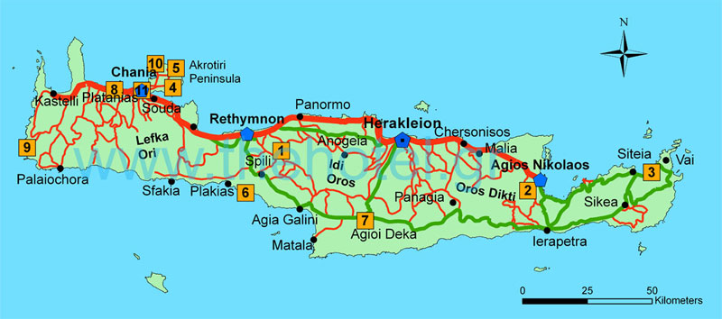 — вдвойне отлично. Сайт сайт предлагает вам очень подробную туристическую карту Крита с русскими комментариями и обозначениями достопримечательностей. Так, отмечены и показаны стрелками самые известные и посещаемые уголки острова: Ираклион и дворец Миноса (Кноссос), Херсониссос , Агиос Николаос , Малия, о.