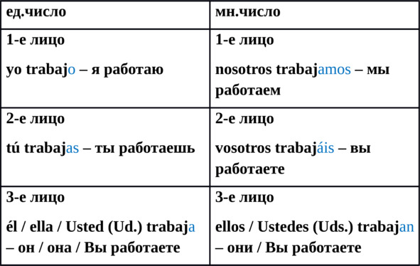 | Русский | yo | tú | Ud./él/ella | nosotros | vosotros | ellos/ellas/Uds. | |