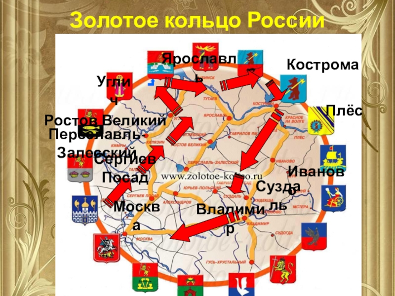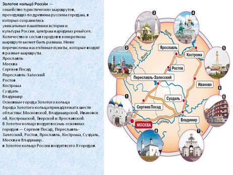 Золотое Кольцо — знаменитейший туристический маршрут России. Он объединяет собой древнейшие российские города, история которых связана с историей становления России. Эти города, не смотря на многолетье, смогли сохранить свою самобытность, свой уникальный уклад жизни, сберегли свои древние памятники архитектуры.