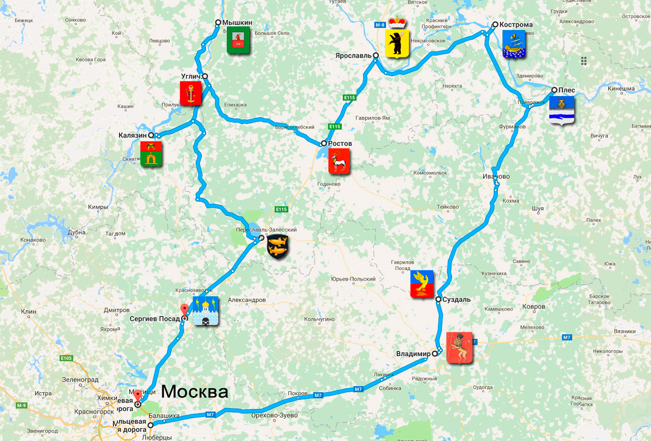 Золотое кольцо России – это знаменитый туристический маршрут протяженностью более 1000 километров. Нет утвержденного списка городов, составляющих Золотое кольцо, но бесспорно в него входят Владимир, Суздаль, Сергиев Посад, Ростов Великий, Ярославль, Кострома, а так же Углич, Рыбинск, Тутаев, Плёс. Маршрут охватывает части Московской, Владимирской, Ярославской, Костромской, Ивановской областей, а теплоходный круиз пройдет только по Ярославской, Костромской, Ивановской и Тверской областей. Большинство из этих городов находятся на реке Волга и имеют причалы.
