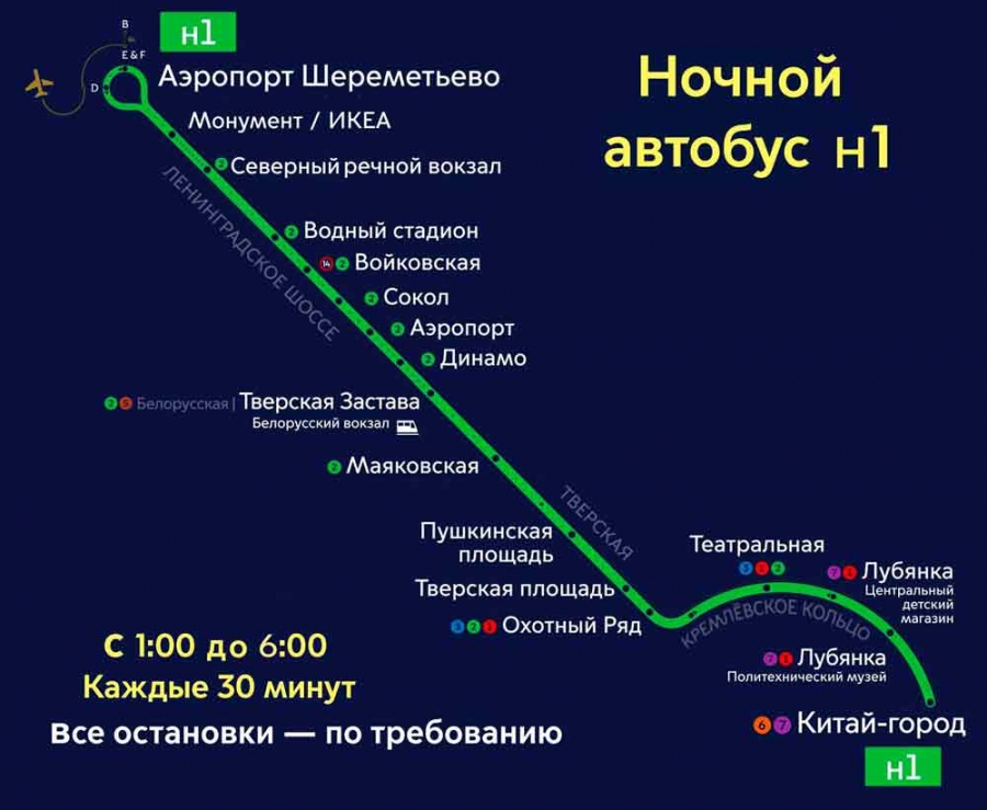 Аэропорт Шереметьево (SVO) – Международное шоссе – Ленинградское шоссе – Северный речной вокзал – Метро «Водный стадион» – Метро «Войковская» – Метро «Сокол» – Ленинградский проспект – Метро «Аэропорт» – Метро «Динамо» – Белорусский вокзал – Метро «Маяковская» – Пушкинская площадь – Тверская улица – Метро «Охотный Ряд» – Метро «Лубянка» – Метро «Китай-город»