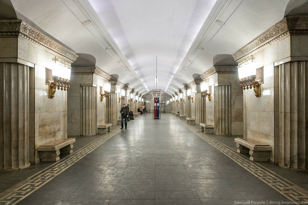 На путевых стенах – рельефный кафель в бело-бежевых тонах. Пространство освещают оригинальные многорожковые люстры, созданные А. Дамским. Они отличаются необычными витыми элементами и вазами, расположенными снизу, между плафонами.