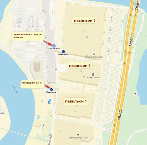 Станция метро «Мякинино» – первый вагон из центра, выходы из метро 1-2 – Выставочный комплекс «Крокус Экспо» (павильон 2 и 3)