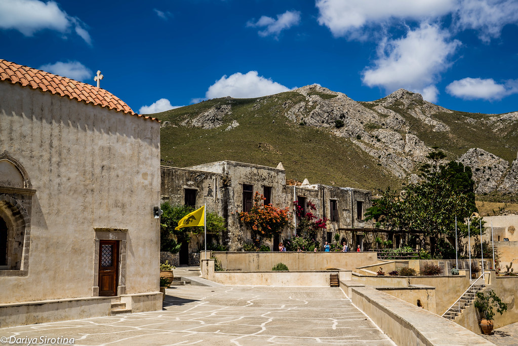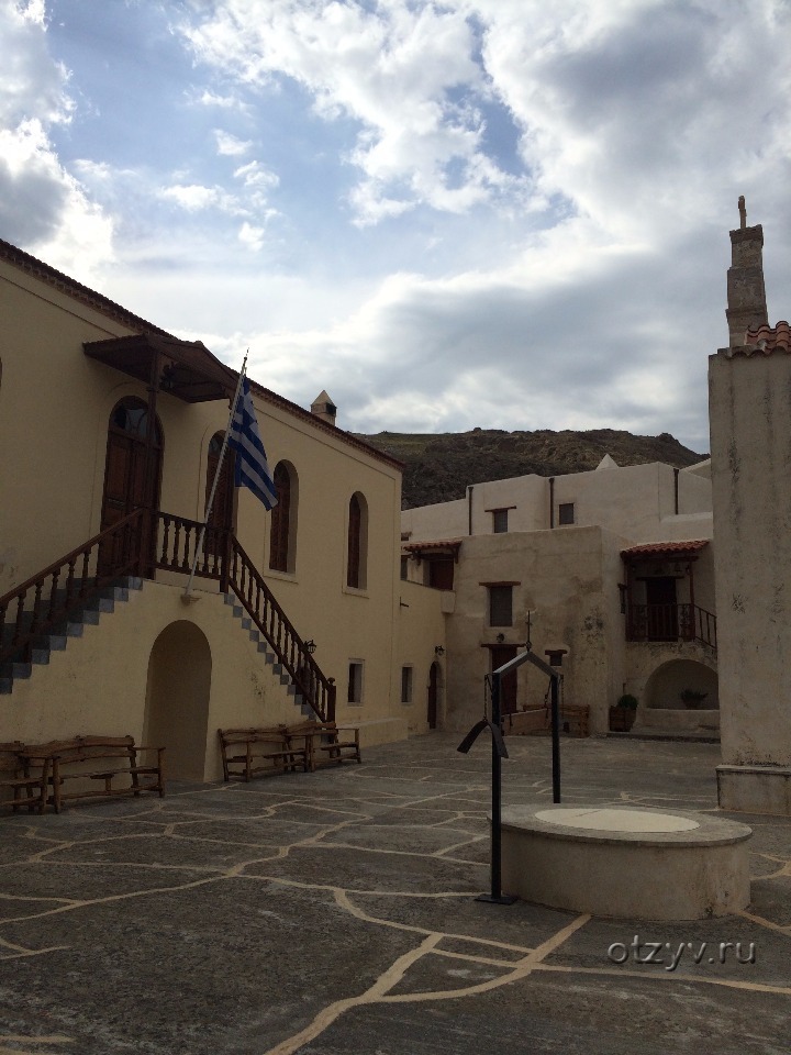 По дороге к монастырю вы увидите памятник Битве за Крит (1941 год): небольшой парк с каменной стелой посередине и скульптурами монаха и английского солдата по обе стороны — и очень вероятно, что ощутите диссонанс, глядя на фигуру в рясе с оружием в руках. В любом случае, остановиться и посмотреть стоит, так как отсюда ещё открывается и потрясающий вид на Ливийское море.