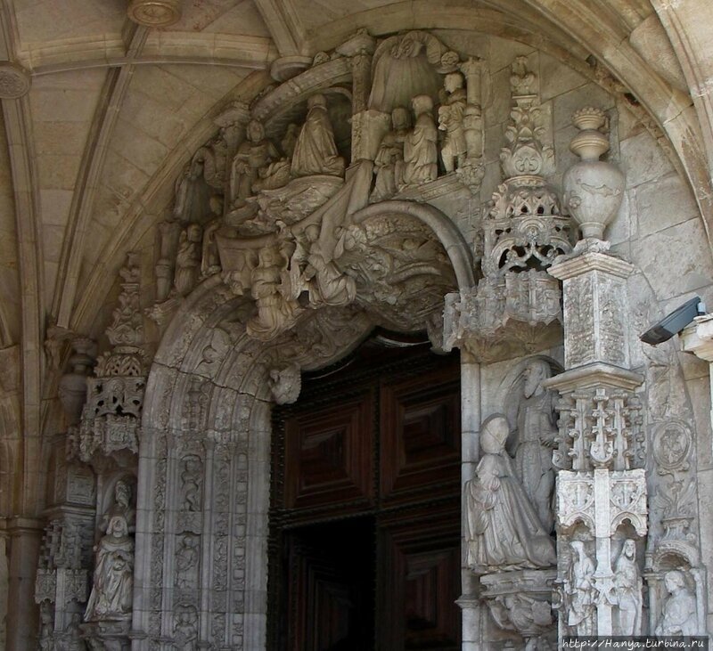 Изысканный и ажурный портал в 1518 году построил Жоан де Каштильо, кастилиец по происхождению. Ему мастерски удалось совместить религиозные мотивы со светскими: так в центре находится Богоматерь, а по краям фигуры святых и отцов Португалии. Колонну меж закрытых дверей венчает статуя Генриха Мореплавателя.