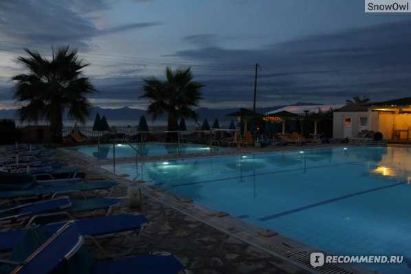 ОТЕЛЬ Acharavi Beach. Здесь останавливались мы. Отель 3 звезды, расположен на 1 линии от пляжа, номера есть как стандарты, так и студии (с кухней). Питание очень достойное, хотя и не очень большой выбор. На ужин 2-3 горячих, закуски, салаты, десерты. Все вкусно. Есть бар на пляже с панорамными окнами и хорошим выбором котейлей. 2 бассейна – взрослый и детский. Номера небольшие, но вполне комфортные. Единственное что не понравилось – ленивые горничные (плохо убирались) и раскладушка (не кровать) для ребенка на доп. месте.