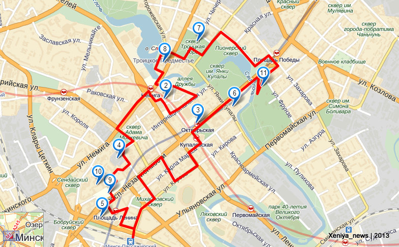 - Прогулка по центру Москвы длиной 5 км. От Театральной площади до Лубянской площади и . Оттуда до ГУМа, вокруг Кремля и до метро «Площадь революции».