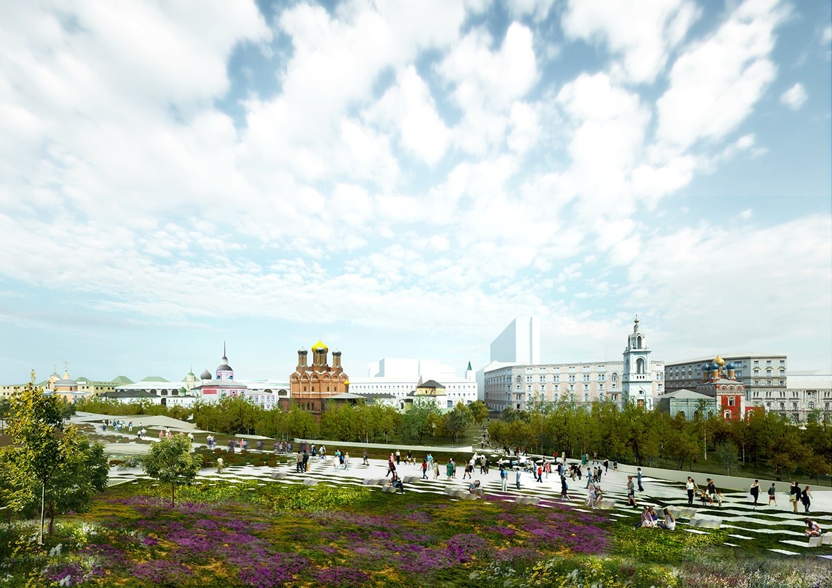 Проект, по которому возводится новый российский парк, стал победителем международного конкурса на разработку ландшафтно-архитектурной концепции «Зарядья». Авторы — интернациональная команда во главе американским бюро Diller Scofidio + Renfo. В состав команды-победителя входили и немецкие инженеры, и российские урбанисты, и итальянские транспортники.