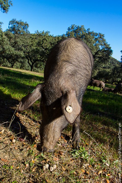 Совсем другое дело хамон иберико. Законодательством установлен минимальный порог — порода свиней, из которых производят хамон иберико, должна содержать не менее 75% генов черной иберийской свиньи, но производители лучшего хамона (включая Cinco Jotas) делают хамон только из чистопородных свиней. В этом случае ведется учет родословной каждого животного, не хуже, чем у заводчиков породистых собак или кошек, а по специальной бирке на хамоне всегда можно узнать родителей и всю историю рода, который дал миру столь достойного отпрыска.