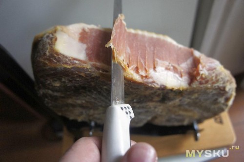 Если вы как-то изловчитесь и рискнёте разделать хамон без всего выше указанного или приобретёте хамонеру и, как заправский картадор приступте с ножом и точилом к хамоней ноге, то должны быть готовы к тому, что часть этой красавицы-ножки придётся выбросить, поскольку перед разделкой надо срезать достаточно толстый слой прогорклого жира и остатков кожи животного. И упаси Вас Бог попробовать хотя бы малейший кусочек этих отходов! На этом Ваша зарождающаяся любовь к хамону закончится навсегда.