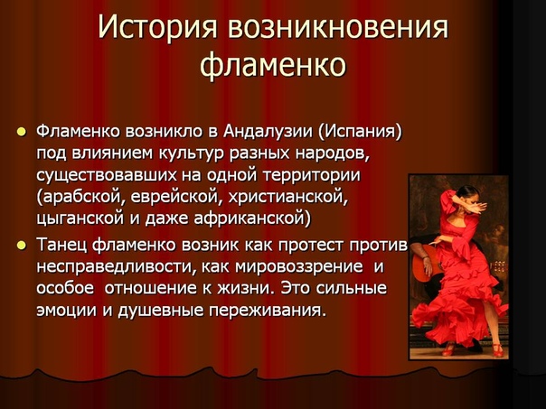 Считается, что влияние Андалусии во фламенко выражается в изысканности, достоинстве и свежести звучания. Цыганские мотивы – в страсти и искренности. А карибские мигранты привнесли в новое искусство необычный танцевальный ритм.