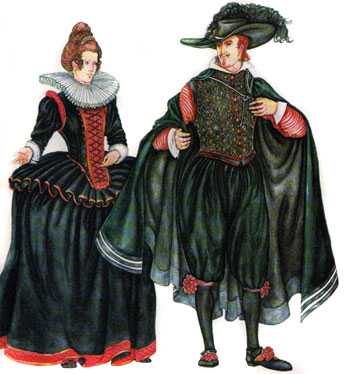 С XVII века аристократические костюмы отшивают из темных тканей, сочетают материалы с разной фактурой по типу шелка, хлопка или бархата. Горожане начинают носить одежду с вставками желтого, красного или малинового цвета. Появился закон о запрете украшения нарядов ажурными кружевами, но модники стали заказывать золотое шитье на одежде. Традиционный укороченный колет приобретает длину, на рукавах появляются прорези, пришивают мягкие валики на плечах. Под камзолом носят белоснежную рубашку с широкими рукавами, от непогоды защищаются с помощью манто, которое напоминало длинный круглый воротник на двух завязках. Мужчины носят зауженные штаны, завязывающиеся под коленами. Вместо пояса для шпаги щеголяют с богато декорированной перевязью на плече в качестве части наfashionapp.ru