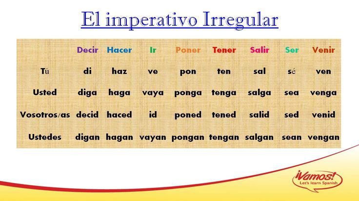 Наиболее распространенными нерегулярными глаголами являются Ser и ESTAR (для BE), Tener (чтобы иметь) и IR (до) и IR (до) и IR 992 ( (чтобы иметь) и IR (до). . Я не буду рассказывать о них в этом уроке, потому что мы уже создали статью и видео для каждого. Так что обязательно ознакомьтесь с ними, когда у вас будет такая возможность!