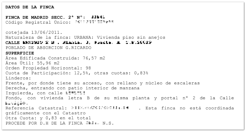 2. Номер недвижимости. Уникальный номер, который присваивается недвижимости в соответствующем реестре собственности. Регистрационный номер недвижимости, указанный в нота симпле редко содержит более шести цифр. Не путайте этот номер с кадастровым номером на недвижимость в Испании, который указывается в квитанциях муниципального налога IBI (Impuesto de Bienes Inmuebles, Налога на недвижимое имущества), который состоит из 7 или 14 цифр и/или букв