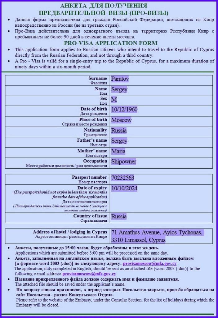 Образец заполнения про-визыНациональная виза Кипра в Украине