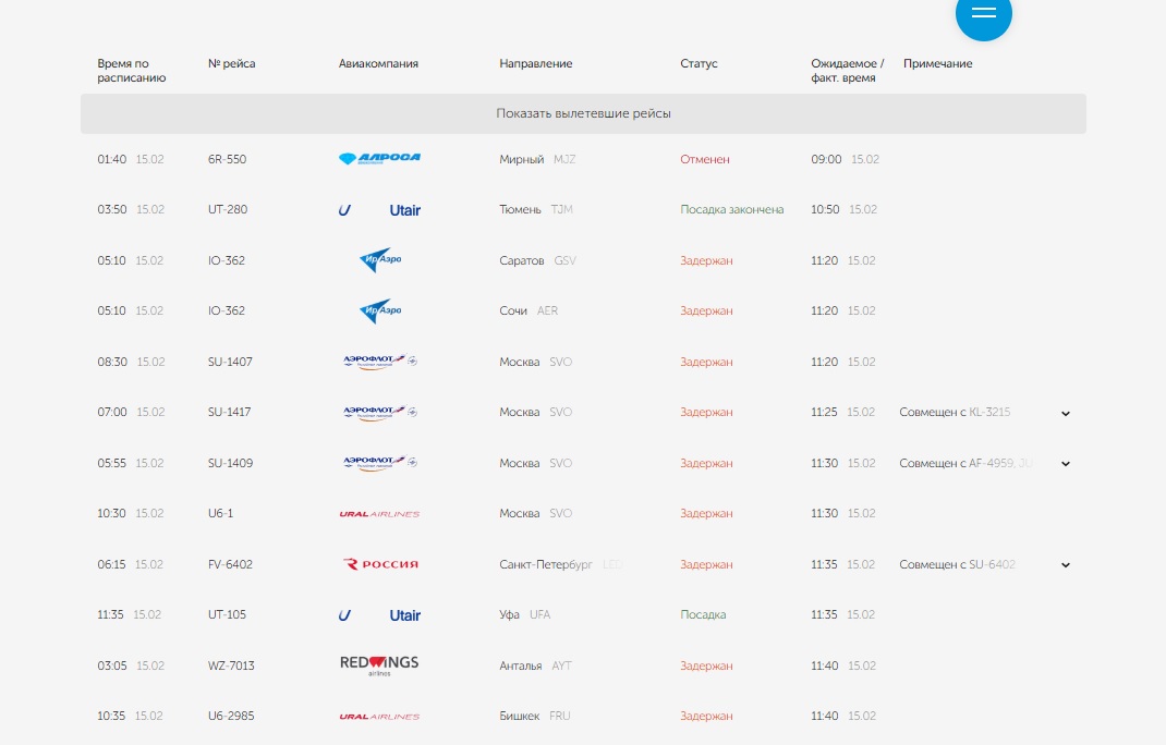 Дополнительную информацию по текущим статусам рейсов, отменам и опозданиям уточняйте по справочным телефонам или на официальном сайте аэропорта.