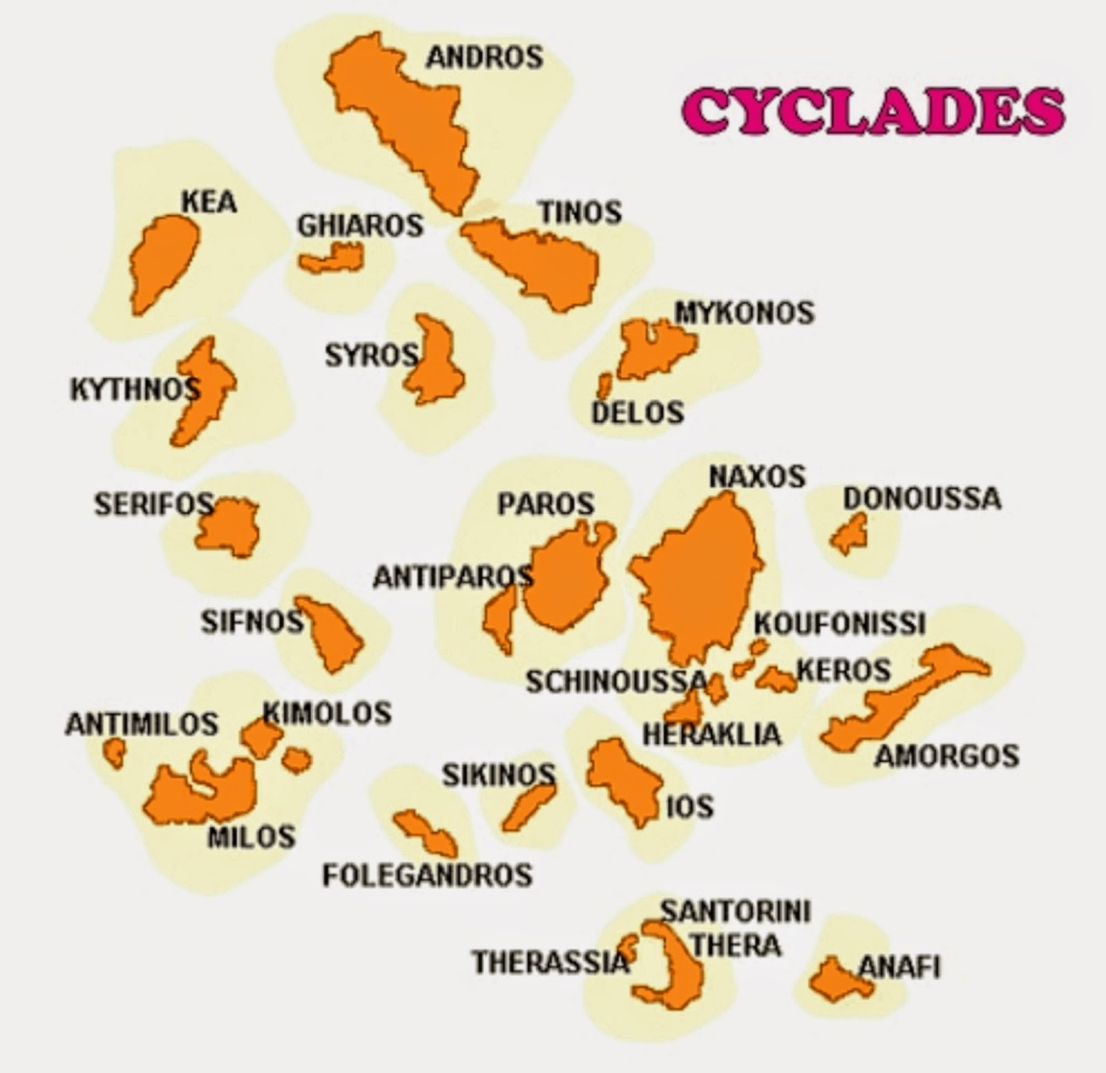 Чтобы лучше представить себе Греческие острова, вот туристическая карта Киклад (). На этой карте перечислены все острова, о которых я говорил, в 15 лучших Кикладских островах. Если вы хотите отобразить легенду карты, просто нажмите на верхнюю левую кнопку (с маленькой стрелкой).