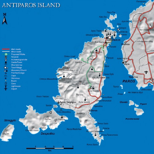 Если Мармара вас не пленила, то, может быть, прельстит умиротворяющая Марписса, чуть южнее: хитросплетение улочек и обветшалых аркад, над которыми нависают балконы в цветах – и всё это как-то рискованно лепится к горному склону. Вы сможете за час подняться на холм Кефалос, на укреплённой вершине которого последние венецианские властители Пароса в 1537 году были побеждены турками. Сегодня на этом месте стоит монастырь Айос Андоньос, но его ограда на замке. Чтобы насладиться видами на восточный Парос и пролив, за которым лежит остров Наксос, перед восхождением попросите ключ у священника в Марписсе (где найти самого церковнослужителя, вам подскажут в мини-маркете).