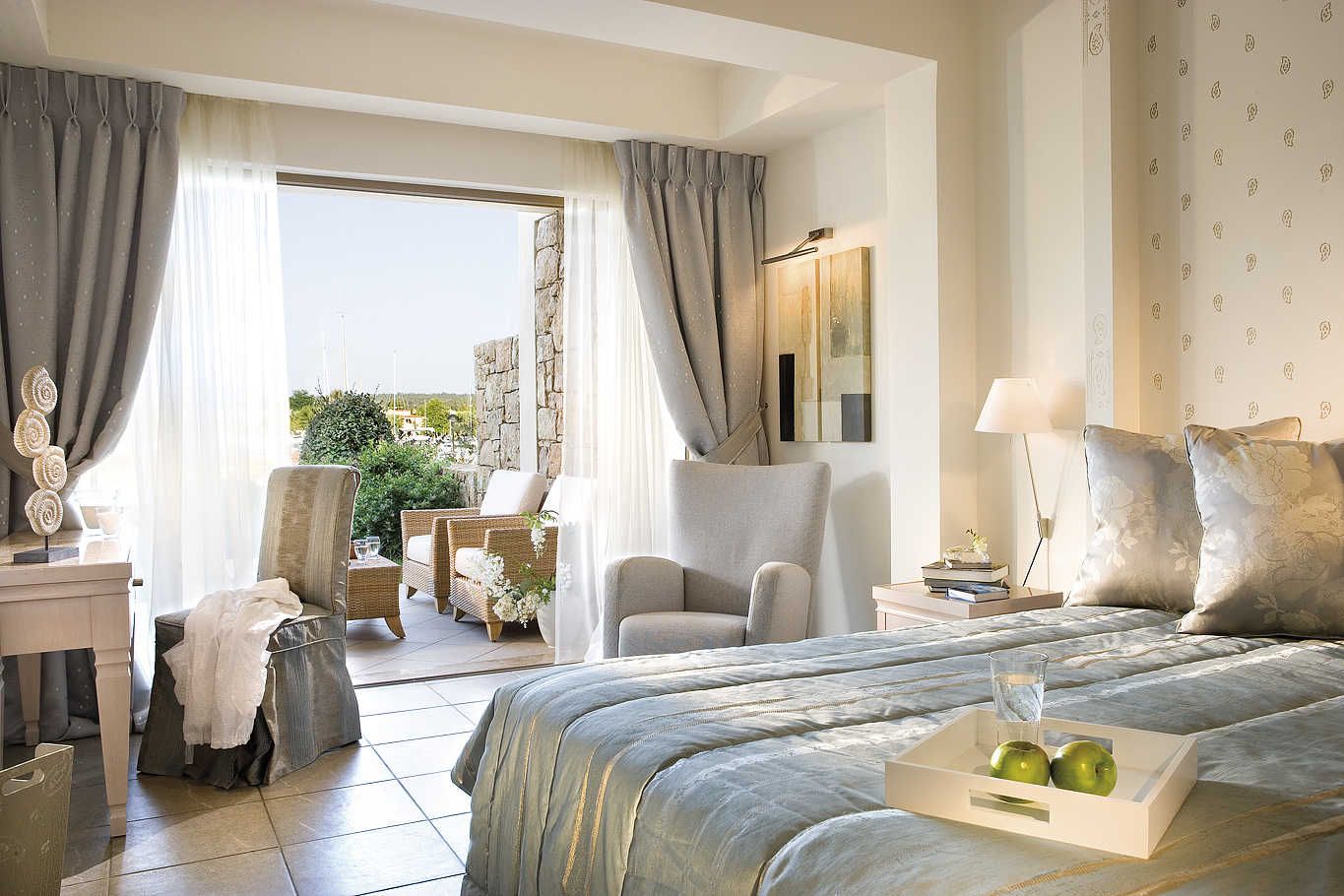Из окон высотой от пола до потолка открываются потрясающие виды на бассейн и цветущие сады или на Эгейское море. В номере одна двуспальная кровать Queen-size с ультра комфортным матрацем Dream Bed, эксклюзивное постельное белье, пуховое одеяло и дополнительные подушки. Плазменный телевизор со спутниковыми российскими и музыкальными каналами, проигрыватель CD/DVD, бесплатный Wi-Fi доступ в Интернет, телефон, электронный сейф (бесплатно), кондиционер/обогрев (регулируется в каждом номере), мини-бар, все необходимое для приготовления чая и кофе, кофемашина Nespresso. Ванная комната с душевой кабиной с тропическим душем или ванной, феном, весами, роскошными махровыми халатами, тапочками. Эксклюзивные туалетные принадлежности Anne Semonin. Балкон или терраса со столиком и двумя стульями. Пол — мраморное покрытие. Ежедневная двухразовая уборка номера, включая вечернюю подготовку постели ко сну.