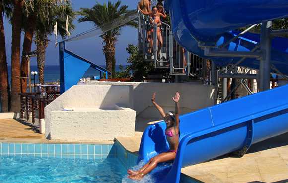 Этот отель Кипра славится своими водными горками разного типа. Здесь можно спуститься с высокой горки «Камикадзе» или побывать на аттракционе «Цунами» с искусственно созданными волнами, которые отличаются по высоте. Дети могут развлекаться в отдельном неглубоком бассейне, в котором есть специальные приспособления. Рядом с бассейнами организовано дежурство спасателей. Постояльцы могут пользоваться услугами аквапарка бесплатно. Гостиница работает по системе «все включено». Цены и отзывы