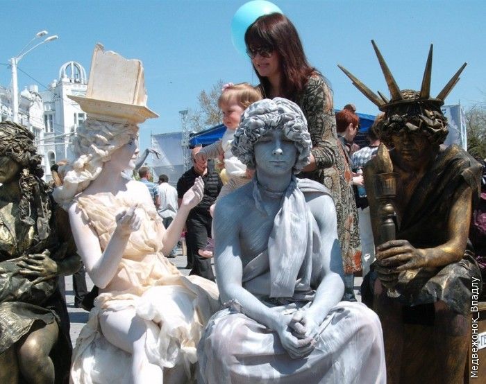 Это люди – актеры, гимнасты, мимы, танцовщики – загримированные таким образом, что становятся похожими на ожившие статуи.