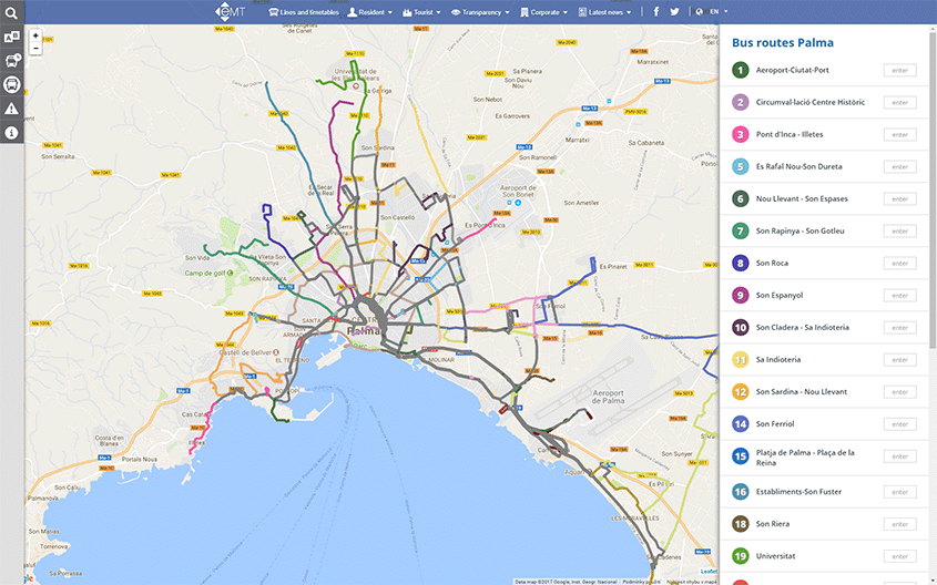 Рейсовые автобусы являются наиболее востребованным видом транспорта, позволяющим не только самому добраться до Пальмы, но и доставить туда свой багаж. Остановка рейсового автотранспорта расположена на нулевом уровне главного корпуса, недалеко от стоянки такси. Найти ее поможет схема аэропорта Пальма-де-Майорки и специальные указатели, расположенные во всех залах терминала. Продолжительность поездки всего 10–15 минут, а интервал движения между маршрутками составляет 15–30 минут. Покинуть аэропорт Пальма-де-Майорка и добраться до города можно 2 рейсами: