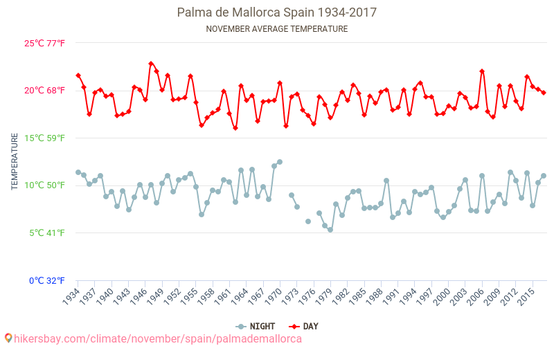 Средиземноморский климат острова гарантирует наступление влажной тёплой зимы в ноябре. Средняя температура воздуха комфортна для европейцев, она держится на уровне 20°C. Температура воды также не пугает — те же 20 градусов. В первой декаде ноября днём воздух прогревается до 22 градусов, но в конце месяца ночью можем наблюдать понижение до 8°C.