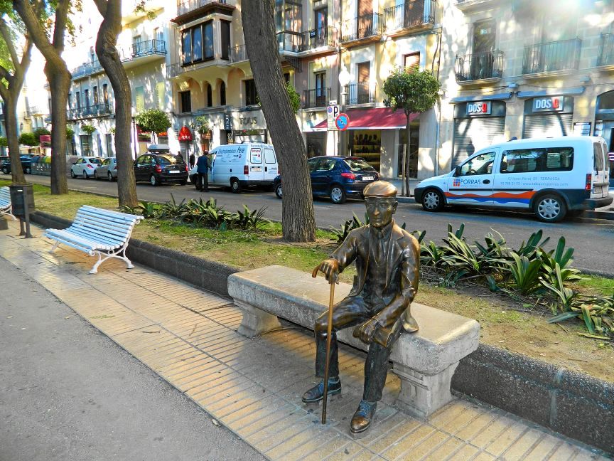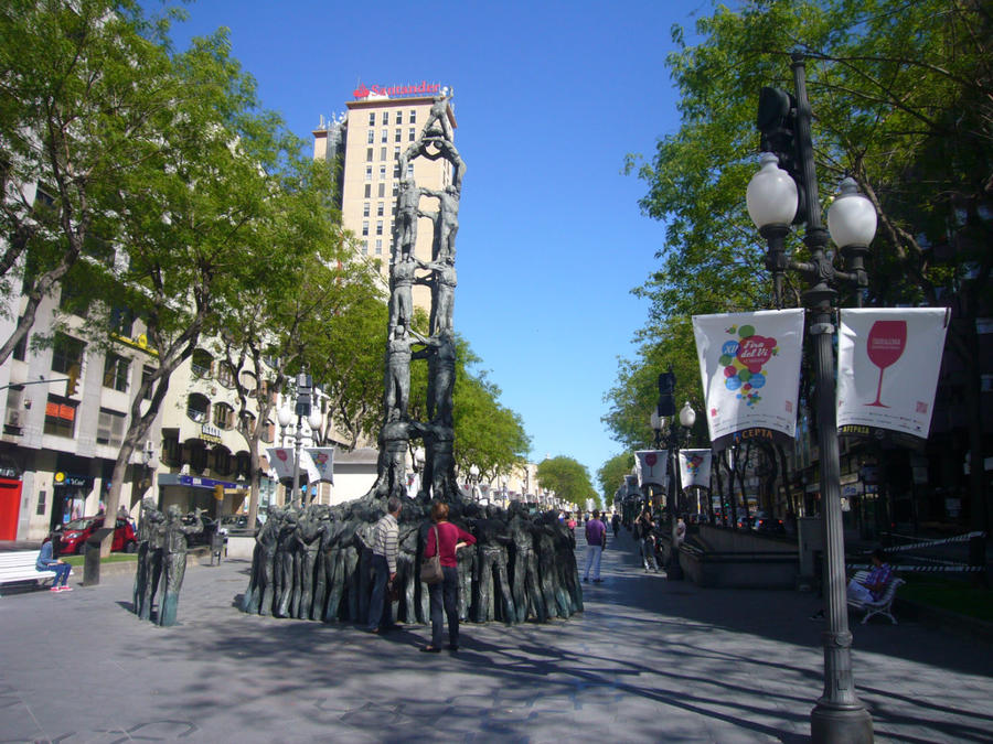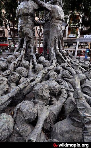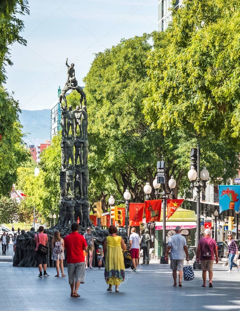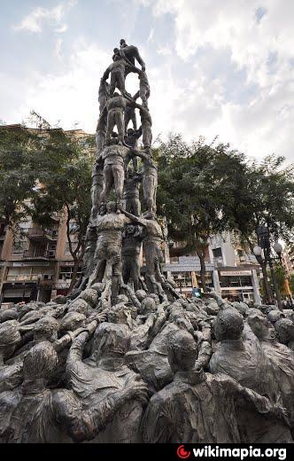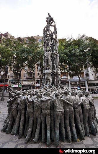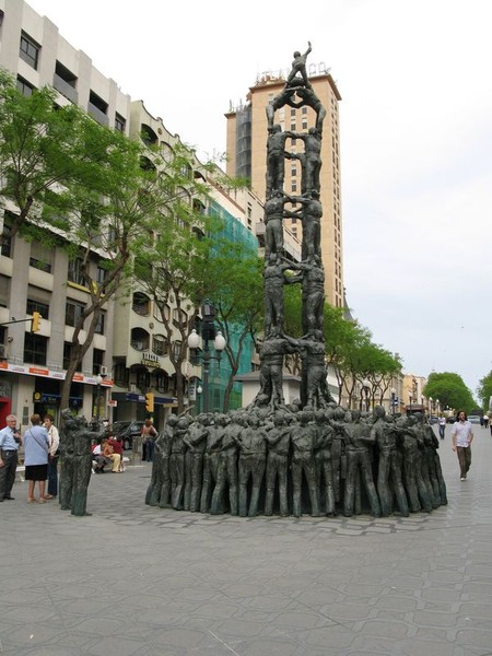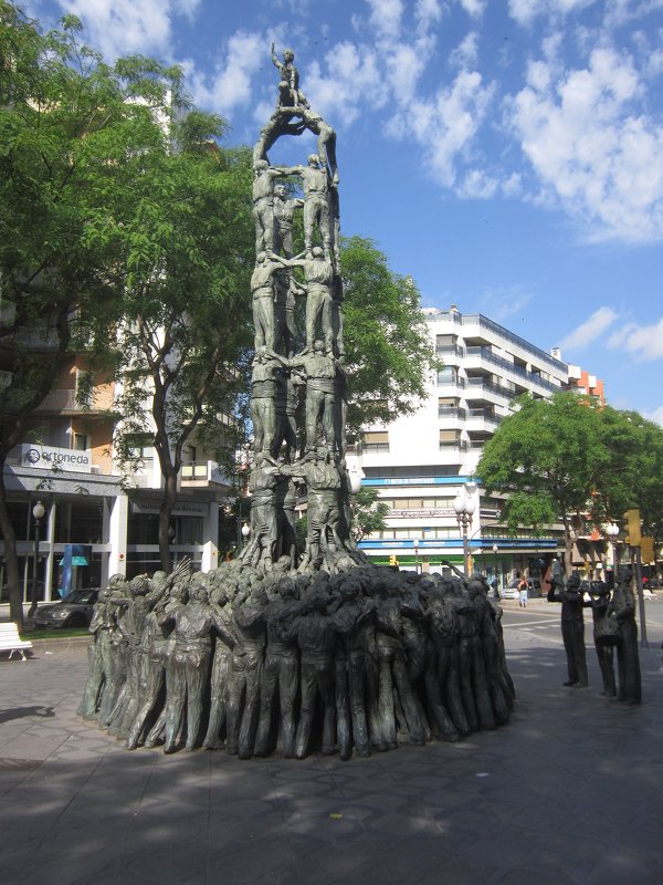 Итак, от площади перед автовокзалом мы пошли по Новой Рамбле, которая была украшена плакатами, посвященными празднику св. Теклы . Первой достопримечательностью на нашем пути (в районе пересечения Новой Рамблы с улицей Carrer del Pare Palau) оказался бронзовый памятник строителям человеческих башен-кастельс (Monument als Castells) (одна из важнейших каталонских традиций).