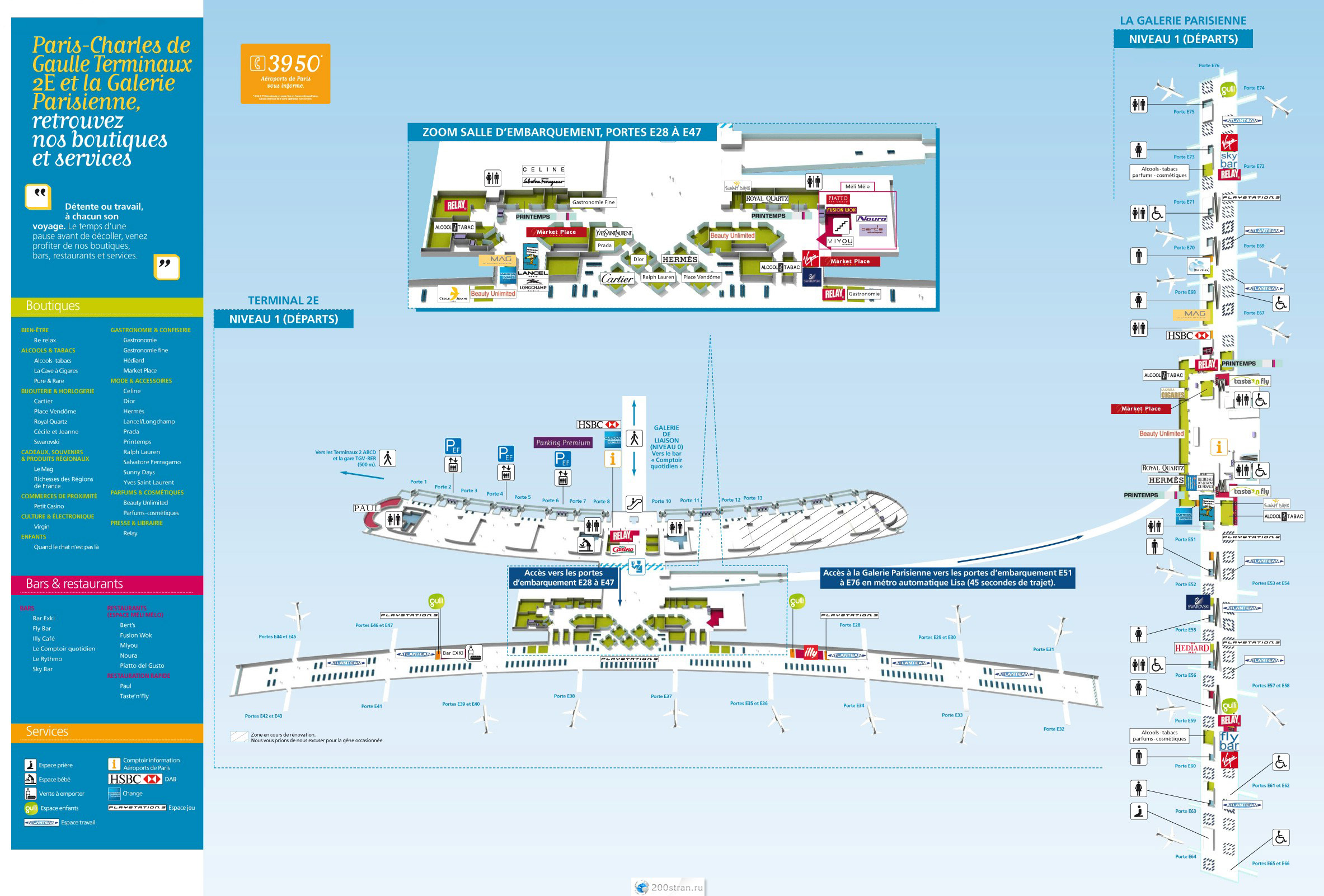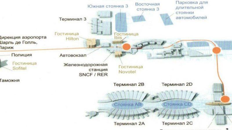 Также, можно скачать отдельные карты каждого терминала и вокзала: Терминал 1, Терминал 2A, Терминал 2C, Терминал 2D, Терминал 2E, Терминал 2F, Терминал 2G, Терминал 3, Карта вокзала SNCF Между терминалами ходят бесплатные шаттлы (автобусы) и поезда CDGVAL. C 1:00 до 4:00 вместо поездов, по тому же маршруту, ходят автобусы. Также в аэропорту есть шаттл басы для транзитных рейсов, которые перемещаются по транзитной зоне.